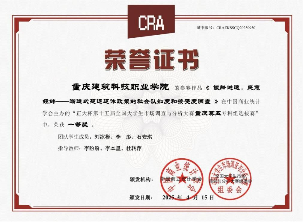 本专业学生积极参加各类职业技能竞赛,近三年共获得国家级二等奖1项,省部级一等奖2项,二等奖4项,三等奖8项。其中在2025年全国大学生市场调查与分析大赛中斩获一等奖,在2024年重庆市职业院校技能大赛商务数据分析赛项中斩获铜奖。