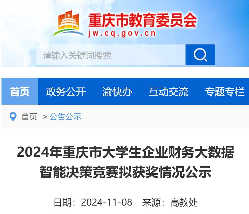 2024年10月,由重庆市教育委员会主办、重庆师范大学承办的2024年重庆市大学生企业财务大数据智能决策竞赛圆满落幕。智慧商贸学院大数据与财务管理专业学生彭瑜、曹楠、刘庆红团队获得高职组三等奖。