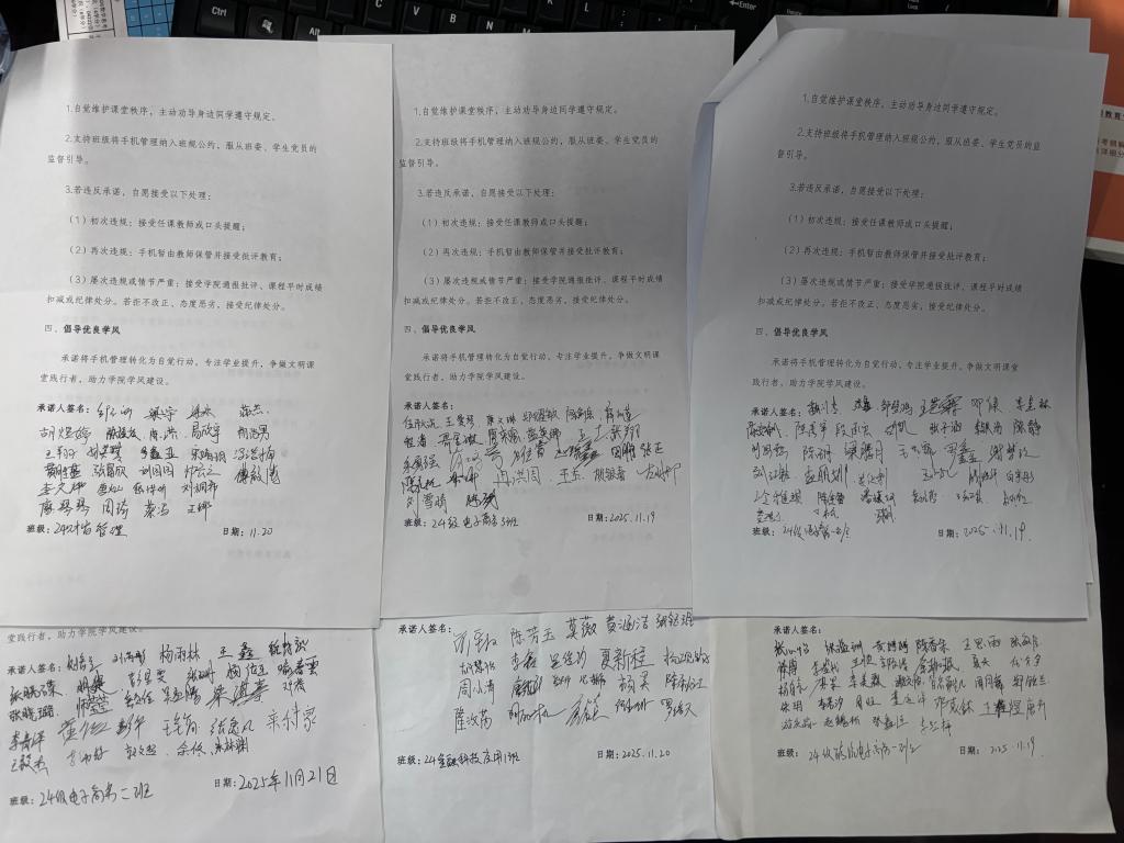 班会最后,各班级发起 "课堂无扰,专注向学" 倡议,全体同学郑重签署《课堂手机使用承诺书》。承诺书明确,同学们将严格遵守学校管理办法,课前主动将手机调至静音或关机状态,按要求放入 "手机休息区" 或个人书包,课堂上不随意取出使用;确因教学需要使用时,将在教师指导下合规操作,不进行与学习无关的活动;同时积极发挥监督作用,共同营造专注高效、纪律严明的课堂氛围。