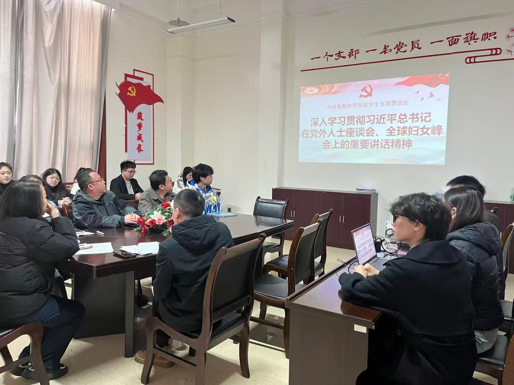 活动当中周庆莲同志系统领学了习近平总书记近期发表的一系列重要讲话和指示批示精神。学习内容重点突出,内涵丰富。与会党员深入学习了习近平总书记在党外人士座谈会和全球妇女峰会上的重要讲话精神,深刻领会其中关于巩固发展最广泛爱国统一战线、促进全球性别平等与妇女事业发展的重要论述;认真研读了习近平总书记给天津大学、中国农业大学全体师生的深情回信,深切感受党中央对教育事业的高度重视和对广大师生的亲切关怀,进一步明确了新时代青年学子肩负的历史责任。会议还集中学习了习近平总书记发表的重要文章《推动落实全球发展倡议、全球安全倡议、全球文明倡议、全球治理倡议》,引导党员从战略高度理解中国为全球治理体系改革与建设贡献的中国智慧和中国方案。同时,活动及时传达了市委六届七次全会精神,要求全体党员准确把握地方经济社会发展大局对高校人才培养提出的新要求。在专题研讨环节,与会党员结合专业背景与个人实际,踊跃发言。大家围绕“如何将总书记重要讲话精神融入日常学习与实践”“如何在服务国家战略和区域发展中贡献商贸学子的智慧”等议题展开热烈讨论。同志们一致认为,作为智慧商贸领域的学生党员,必须持续加强党的创新理论学习,胸怀“国之大者”,将个人发展融入国家发展伟业,不断提升专业素养和综合能力,努力成为堪当民族复兴重任的时代新人。本次主题党日活动主题鲜明、内容扎实、研讨深入,有效提升了支部活动的政治性、时代性、原则性、战斗性。它不仅是一次深刻的理论学习会,更是一次凝聚共识、鼓舞士气的动员会。智慧商贸学院学生党支部将持续深化理论武装,创新活动形式,引导全体学生党员自觉用党的最新理论成果武装头脑、指导实践、推动学习,在以中国式现代化全面推进中华民族伟大复兴的新征程中展现青春作为。