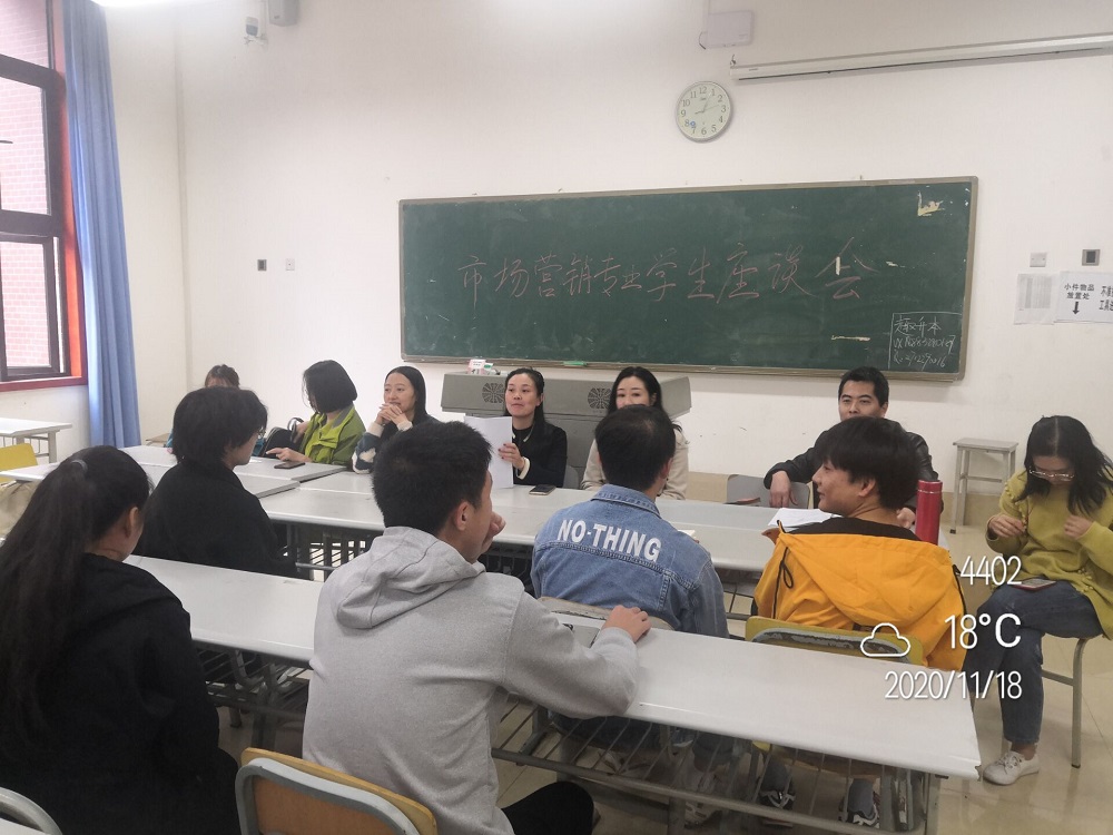 2020年11月18日中午,市场营销教研室在4402教室组织市场营销专业学生召开了中期座谈会,教研室9名教师,市场营销18级至20级30位同学代表参加了座谈会。
