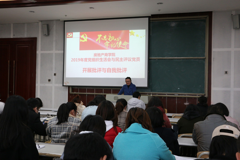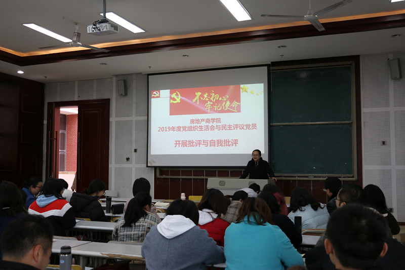 为深入贯彻落实习近平总书记在“不忘初心,牢记使命”主题教育工作会议上的重要讲话精神,全面把握“守初心、担使命,找差距、抓落实”的总要求,进一步增强基层党支部凝聚力和战斗力,加强教工党员党性修养,把初心和使命融入学院党建和改革发展中。2019年11月29日下午,房地产商学院党总支在笃学楼3405教室召开了组织生活会并开展民主评议党员互动。本次会议由房地产商学院学生党支部组织委员姚骏同志主持,党总支书记孙佳、房地产商学院教师党支部、学生党支部全体成员参加了本次会议。