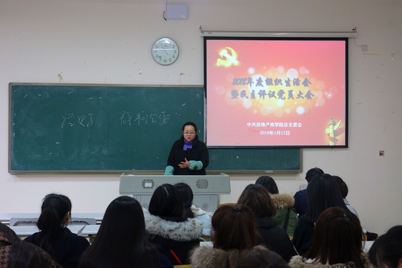 为深入学习贯彻党的十九大和市委五届三次全会精神,房地产商学院党总支、教师党支部、学生党支部于2019年1月17日在3408教室集中召开了组织生活会和民主评议党员会议。学校纪委书记陈锦连,房地产商学院党总支书记孙佳、教工党支部廖忠友书记、学生党支部陈小雨书记、教工党支部任媛副书记、党总支高雅组织员以及学院全体党员参加了会议。会议由房地产商学院党总支书记孙佳主持。