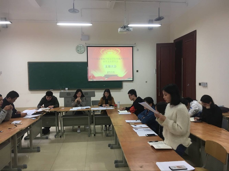 2018年10月24日,中共重庆房地产职业学院房地产商学院学生党支部在3401召开了支部大会,参加本次会议的有房地产商学院党总支副书记孙小川,党支部组织委员金洪帅,支部宣传委员詹娟等8名正式党员以及12名预备党员,此次大会由支部书记陈小雨同志主持,会议议题主要是讨论杨素华等4名同学吸收为预备党员的问题。