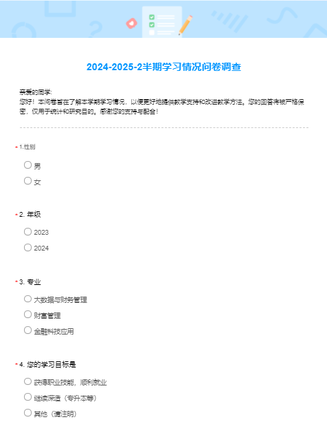 临近期中教学检查,为全面了解学生学习情况,进一步优化教学管理,提升教学质量,智慧商贸学院智慧财务教研室近日通过线上问卷形式开展了一次针对学生学习情况的调研活动。此次问卷调查旨在为即将召开的师生座谈会做准备,通过收集学生的意见和建议,有针对性地改进教学方法,提升教学效果。