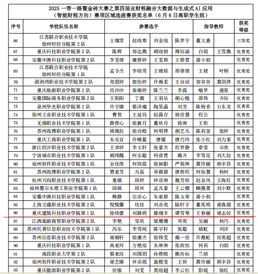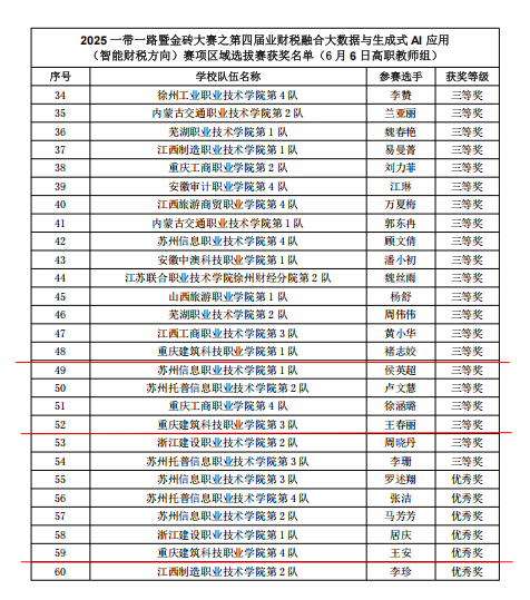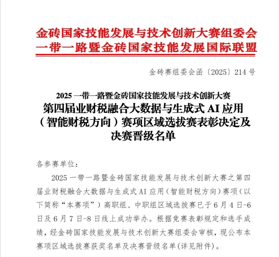 近日,2025年一带一路暨金砖国家技能发展与技术创新大赛第四届业财税融合大数据与生成式AI应用(智能财税方向)赛项区域选拔赛圆满落幕,Kaiyun官方网站登录入口大数据与财务管理专业师生在此次大赛中表现出色,其中教师参赛荣获三等奖二项、优秀奖一项,学生参赛获优秀奖一项,褚志姣老师顺利晋级国赛。