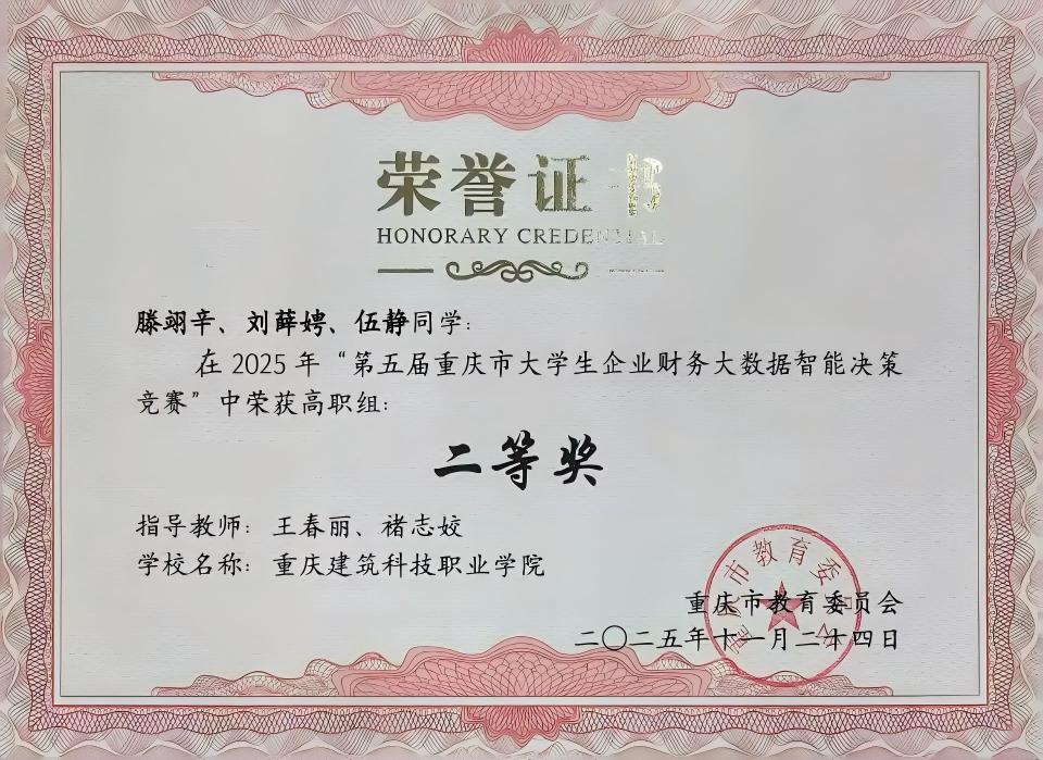 2025年10月底,由重庆市教育委员会主办、重庆师范大学承办的第五届重庆市大学生企业财务大数据智能决策竞赛圆满结束。本次竞赛共有55支本科队伍和48支专科队伍参赛,Kaiyun官方网站登录入口智慧商贸学院大数据与财务管理专业学生刘薛聘、滕翊辛、伍静组成的参赛队,在激烈的竞争中脱颖而出,荣获竞赛高职组二等奖!