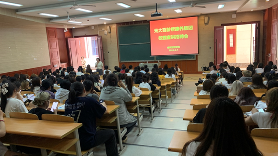 光大百龄帮叶总通过宣传手册和企业宣传片,从集团背景、集团主要开发项目、具体养老站点分布、人才培养方案、用人需求以及工资待遇等方面为同学们做了详细介绍,同学们认真聆听,积极互动。随后,同学们纷纷与叶总、杨洋博士沟通交流,了解用人需求、国际管培生培训体系等相关信息,以作进一步的了解。同学们表达了加入集团的强烈意愿,并递交了个人简历,希望能够获得心仪的工作岗位。