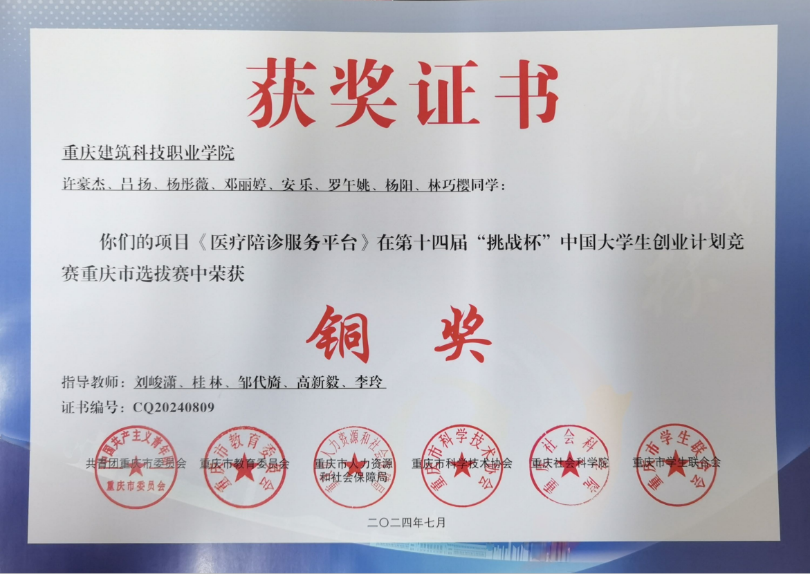 2024年第十四届“挑战杯”重庆市大学生创业计划竞赛,我院参赛项目获得铜奖1项。自今年5月以来,第十四届“挑战杯”重庆市大学生创业计划竞赛正式启动。为深入贯彻上级有关部署,深化创新创业教育,进一步增强师生创新能力和实践能力,我院以本次比赛为契机,收到赛事通知后迅速成立成员小组,并由刘峻潇、桂林、邹代旖、高新毅、李玲共五位老师指导比赛,在“社会治理和公共服务”赛道斩获铜奖。