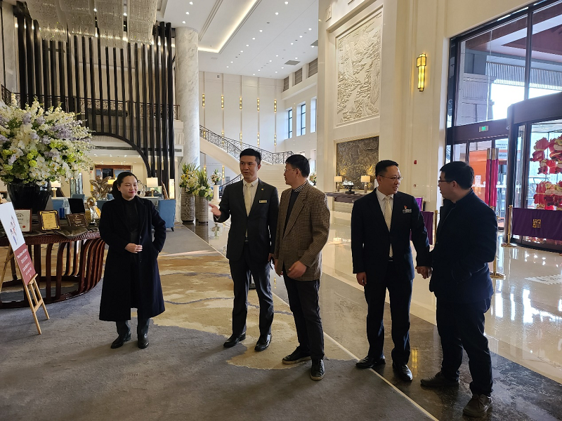 在渝州宾馆兰辉副总经理、渝州宾馆人事质检部秦力知总监、渝州宾馆房务总监张以诺、渝州宾馆人事质检部副总监龙港的带领下,何超副校长一行首先参观了重庆渝州宾馆商务接待区和政务接待区,张以诺总监详细介绍了渝州宾馆房务部(前厅)4D管理,兰辉副总经理、秦力知总监介绍了渝州宾馆基本情况和政务接待开展的成果。重庆市渝州宾馆创建于1958年,是重庆市机关事务管理局下属事业单位(重庆市政务接待服务中心),宾馆也是重庆市唯一“国宾馆”、中国五叶级绿色饭店、中国国宾馆协会副主席单位、中国城市政务酒店联盟副理事单位、重庆市酒店行业协会会长单位。