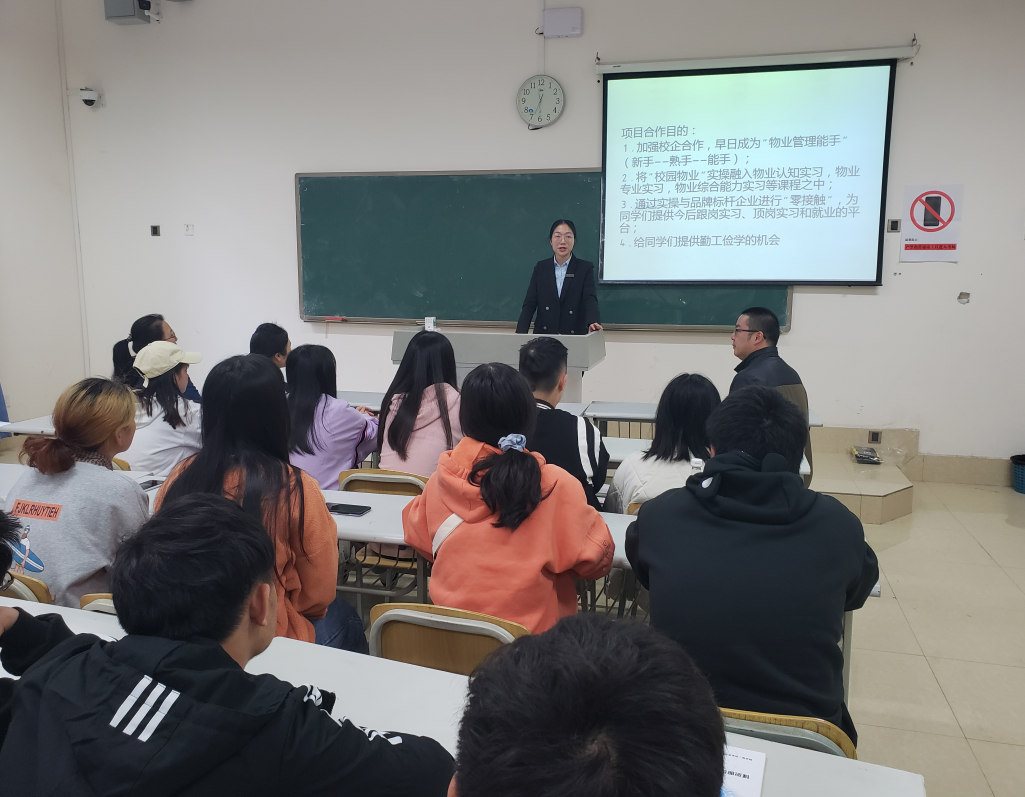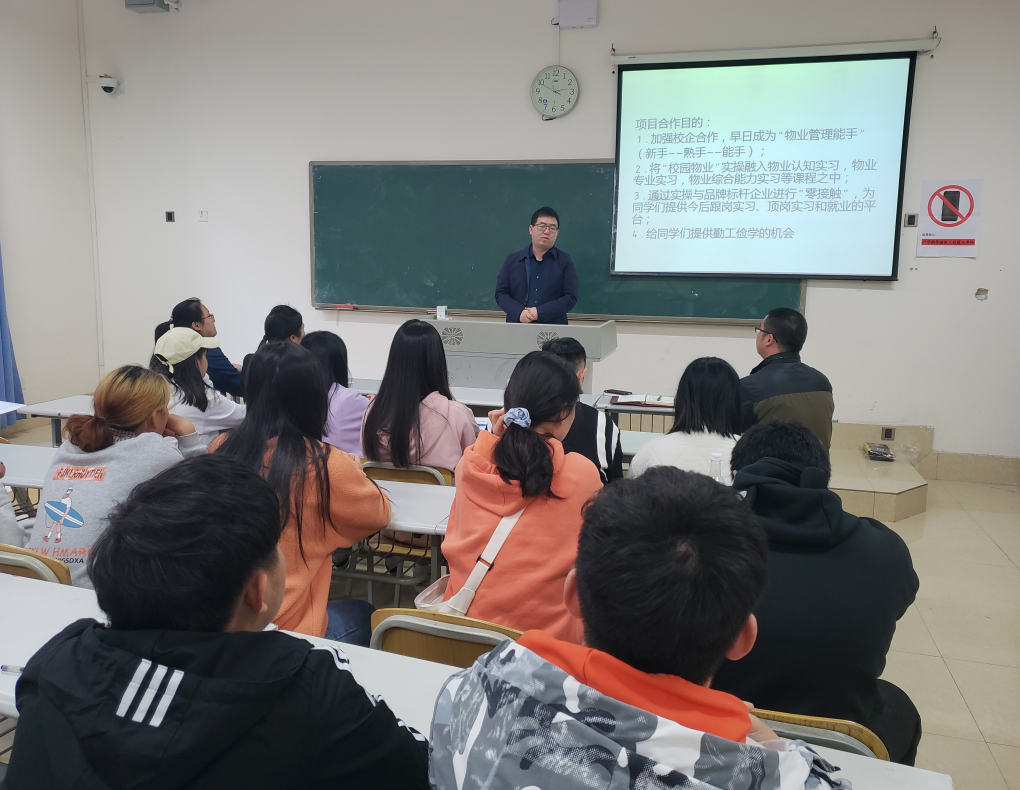 此次启动仪式由叶昌建主任主持,首先叶主任就此次校园物业校企合作项目做了简单介绍,紧接着李梅经理从企业角度讲述了同学们可以在此次项目中的收获,建筑管理学院郝院长也从自己的经历给同学们分享了此次合作项目对于同学们的意义,最后由新鸥鹏物业的周主管将项目具体的安排做了详细介绍。