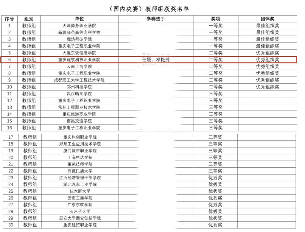大赛启动以来,建筑管理学院领导高度重视,教师们精心准备,不断学习和训练,反复打磨,经过预赛的软件操作和报告撰写,以小组第一的优异成绩进入决赛,在决赛过程中,任媛老师和邓艳芳老师展现出良好精神风貌,以拼的姿态、胜的决心,在项目汇报、答辩过程中思路清晰、表达流畅、沉着冷静、默契协作,最终取得2023第七届一带一路暨金砖国家技能发展与技术创新大赛教师组第六名银牌的好成绩。