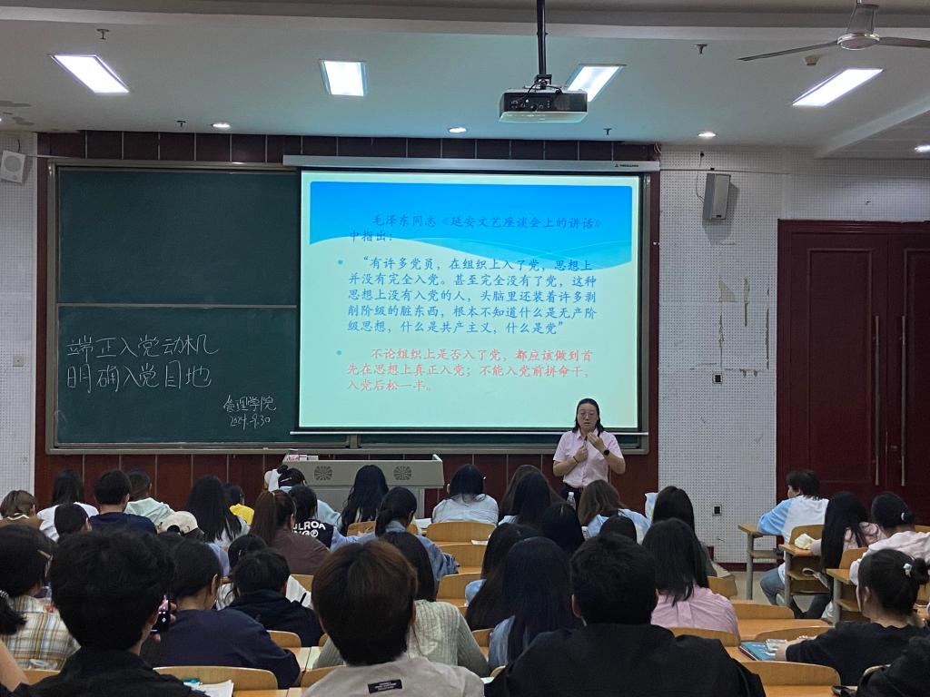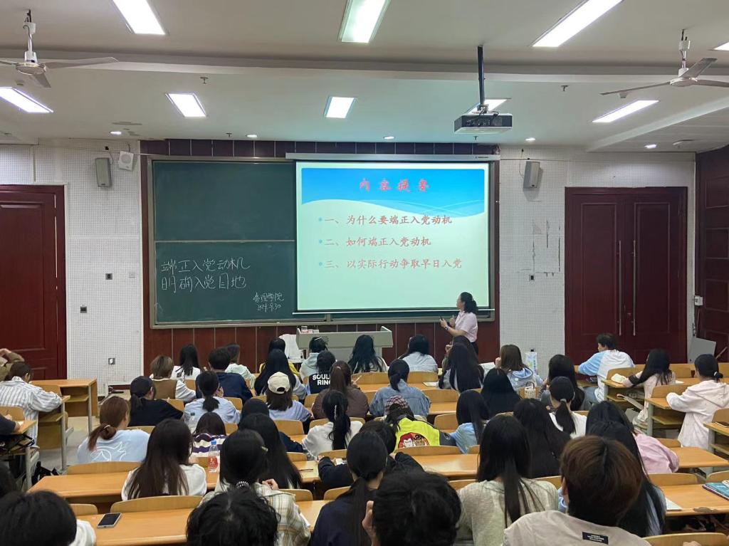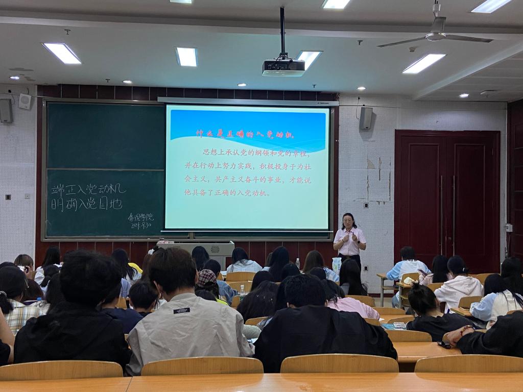 为了进一步加强同学们对党的基本理论知识的学习理解,提高同学们的理论水平,确保入党积极分子的发展质量。智慧康养学院学生党支部于2024年9月30日在笃学楼2205教室开展了第28期全体入党申请人第二次培训课:《端正入党动机,明确入党目的》。参会人员有第28期全体入党申请人,党总支书记殷源同志作为本次培训课的主讲人。