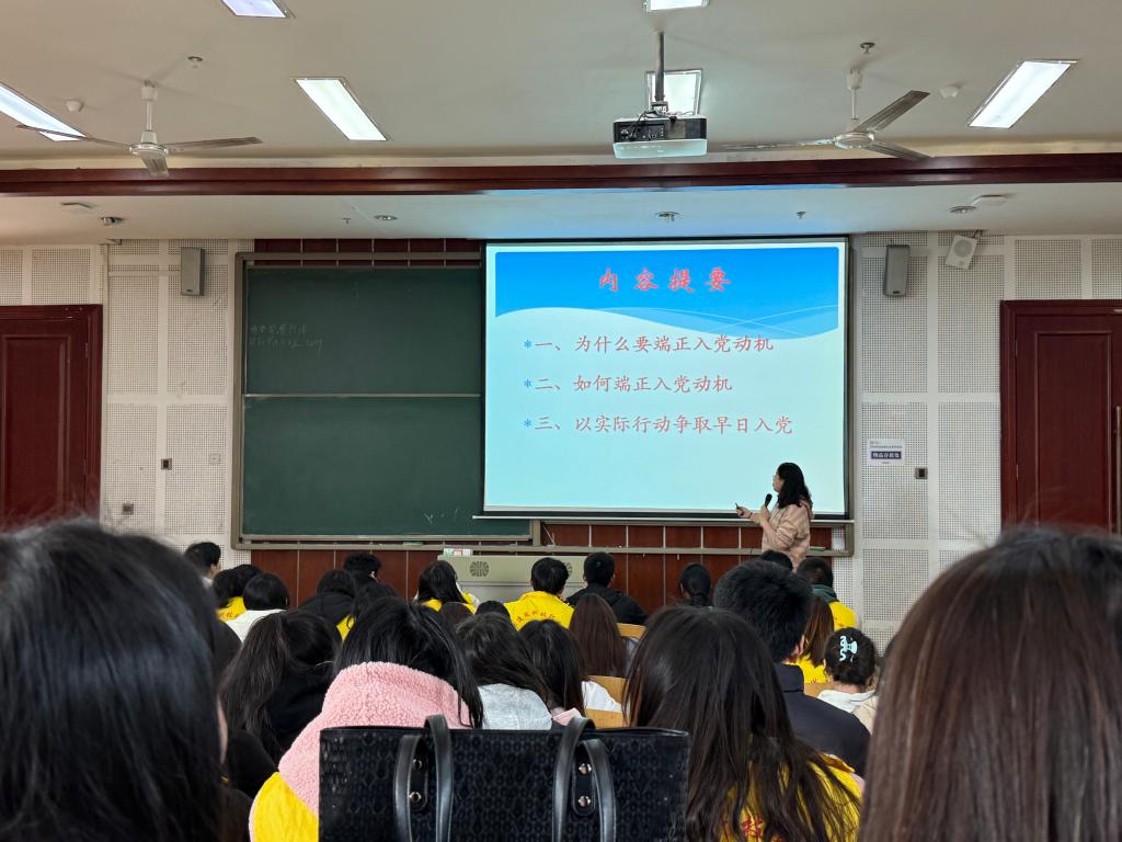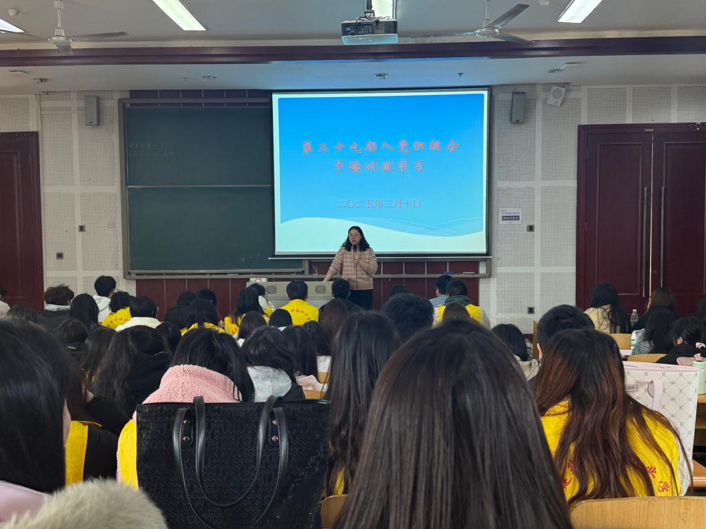 本学年第29期入党积极分子培训班于3月10日开班了,共有来自全校六个二级学院的积极分子111人参加。培训第一讲题为“端正入党动机,明确入党目的”。旨在加强入党申请人对党的深刻认识,从而进一步提高同学们思想道德素养,逐渐树立正确的世界观、人生观和价值观,克服不正确的入党动机,以确保党组织的先进性和纯洁性。