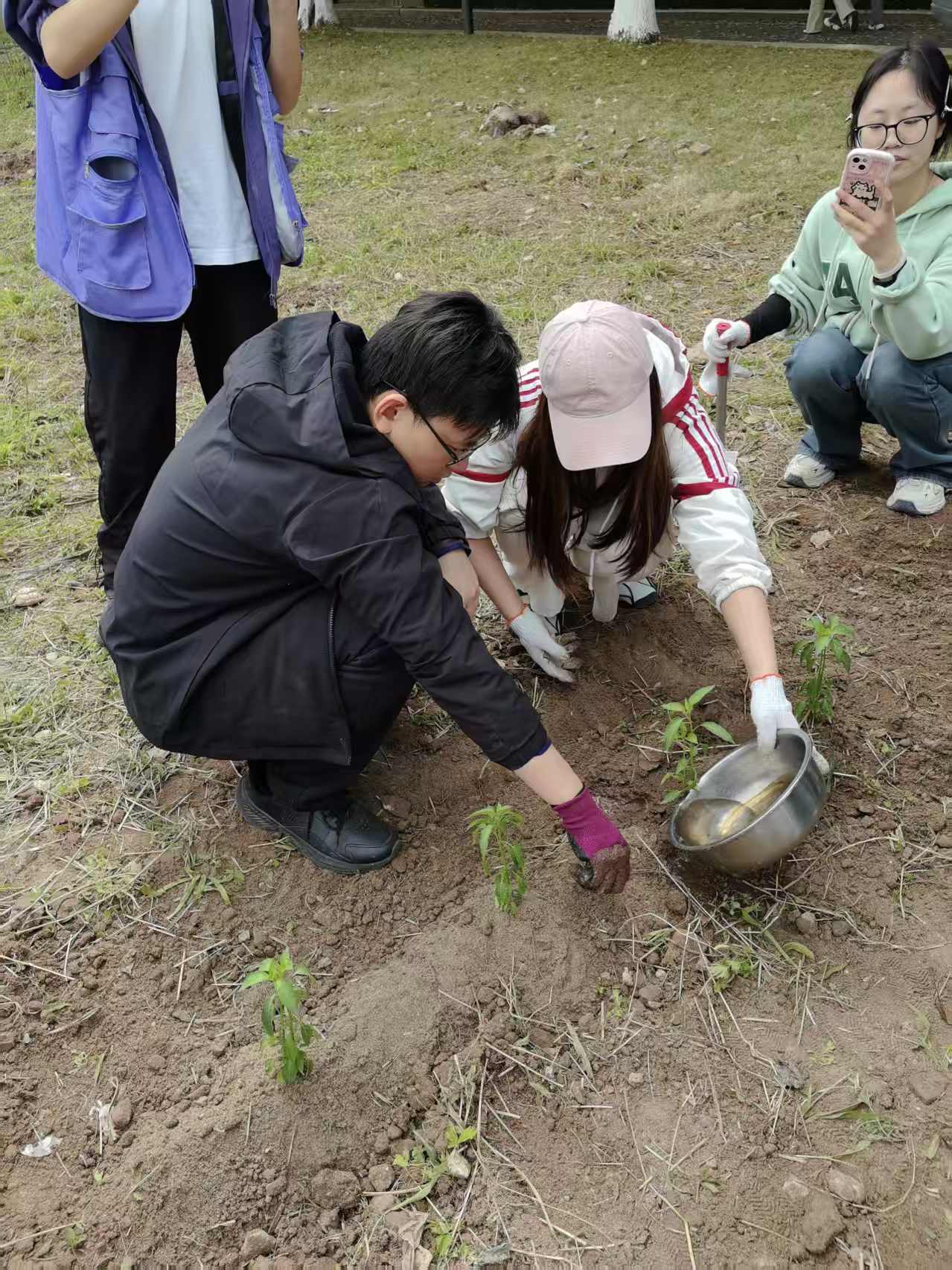 活动现场,师生们手持锄头、铁锹、菜苗盆等工具迅速投入劳动。教师率先垂范,从种植区域规划、土壤翻整到蔬菜栽种,逐一讲解示范;志愿者们主动担当,分组协作,翻耕土地、挖沟起垄、定植菜苗,有序栽种辣椒、玉米、番茄等蔬果苗。大家分工明确、配合默契,尽管裤脚沾满泥土,却干劲十足,忙碌的身影成为校园里一道亮丽的劳动风景线。