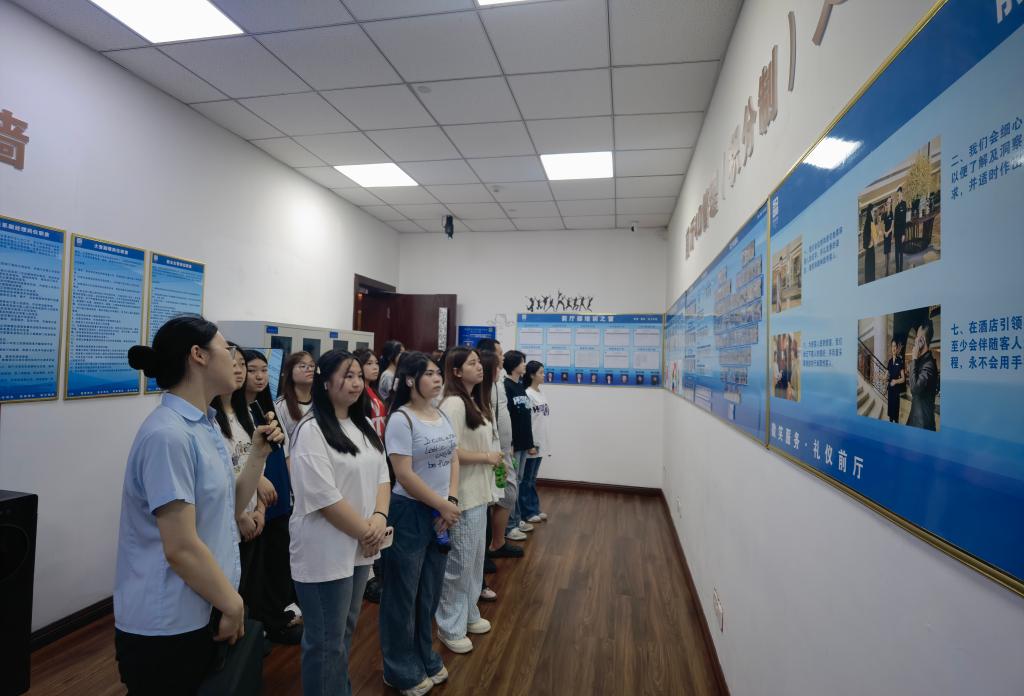 渝州宾馆管理团队带领同学们参观了酒店大堂、宴会厅、客房区、及员工宿舍、食堂等区域,并详细讲解了酒店发展历程,介绍了渝州宾馆作为重庆市政务接待标杆单位的品牌文化与服务理念。通过实地参观和讲解,让书本上的知识变得触手可及,同学们近距离感知和了解了现代酒店的服务流程与管理模式,对专业内涵有了更直观深刻的认知。在参观的同时,两位经理结合企业招聘的需求,向同学们分析了当前行业对复合型人才的能力要求,帮助同学们认清了未来职业发展所需的“技能拼图”,让大家对努力方向有了更清晰的认知。