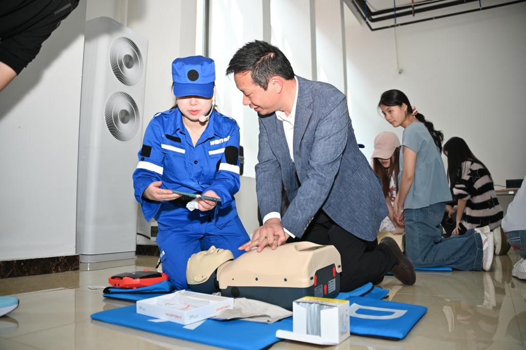 揭牌后,首期“救在身边”急救培训开课。AHA认证导师团队利用高仿真智能模拟人,重点讲解示范成人心肺复苏(CPR)、自动体外除颤器(AED)使用、海姆立克急救法及创伤止血包扎等技能。参训师生分组练习胸外按压与人工呼吸,导师逐一纠正按压深度、频率及胸廓回弹等细节,确保动作达到国际标准。