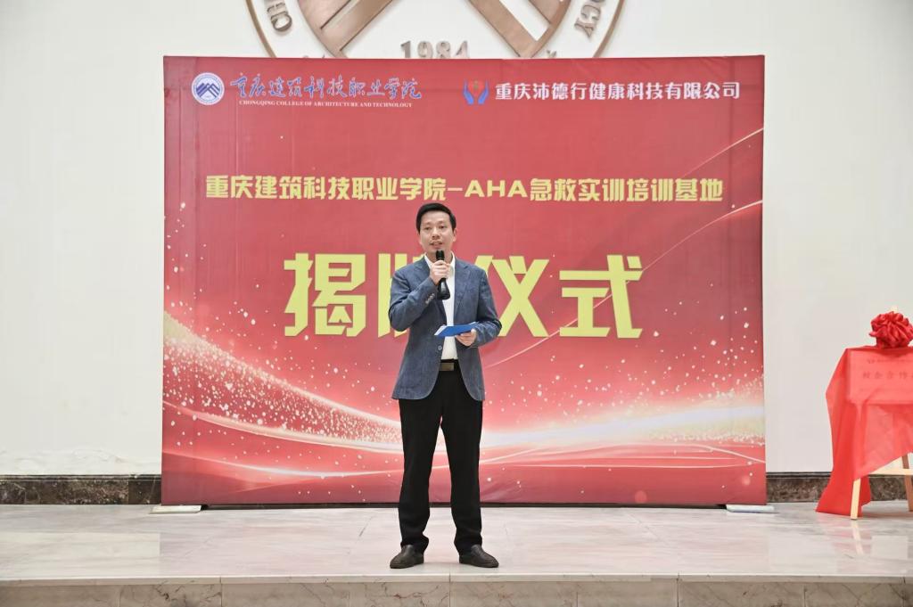 为深入贯彻落实《“健康中国2030”规划纲要》,提升校园应急救护能力,4月10日上午,学校与重庆沛德行健康科技有限公司联合共建的“AHA培训中心急救实训培训基地”揭牌仪式在智慧馆实训大楼举行。继续教育学院彭汝伦院长、智慧康养学院周福亮院长、殷源书记、刘轶副院长,企业总经理莫大瑞及导师团队,师生代表共100余人参加活动。
