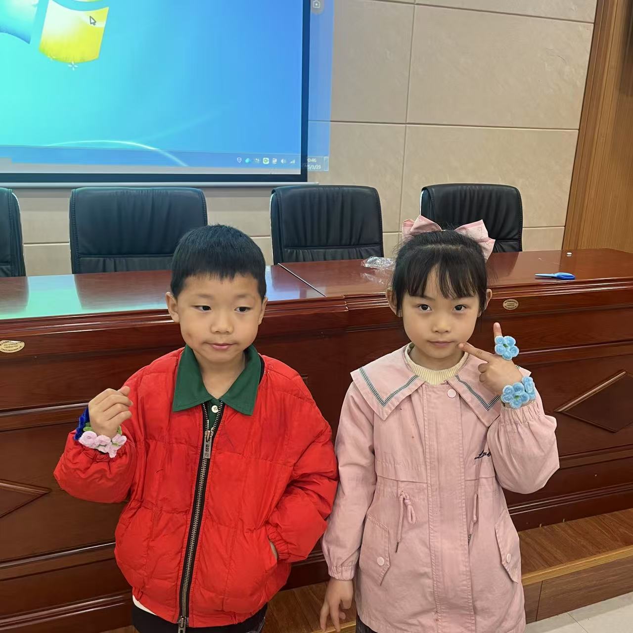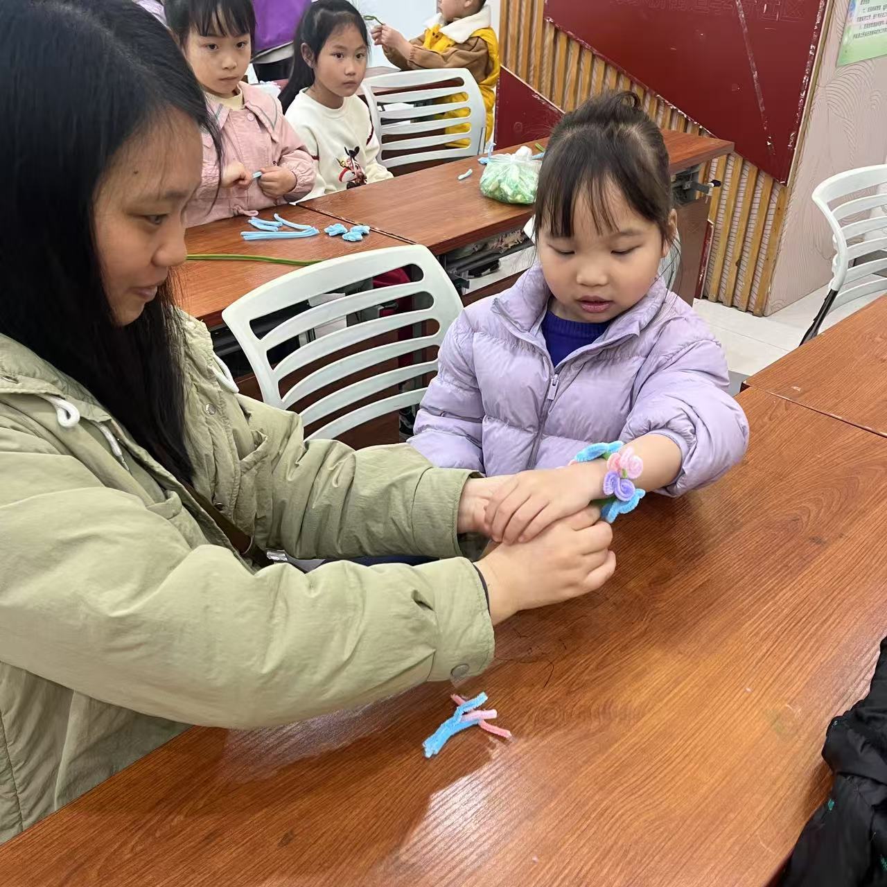 活动开始,由星火志愿队的小老师们现场教学,一步步带领小朋友们制作小花朵,我们的志愿者为小朋友们分发五颜六色的扭扭棒,五彩缤纷的扭扭棒在孩子们的小手中舞动,经过弯曲、缠绕、拼接,一朵朵栩栩如生的花朵逐渐成型,穿成串的小花环戴在小朋友的手腕上,与孩子们天真的笑脸交相呼应!