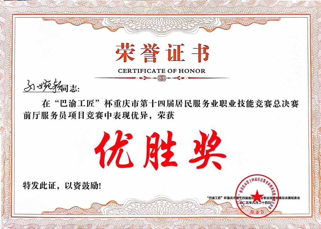 近日,由重庆市商务委员会、重庆市人力资源和社会保障局、重庆市总工会、共青团重庆市委、重庆市妇女联合会五部门联合主办的“巴渝工匠”杯重庆市第十四届居民服务业技能竞赛总决赛隆重举行并圆满落幕。智慧康养学院师生代表队在此次高水平技能盛会中奋勇争先,表现卓越,在多个赛项中连创佳绩,最终斩获一等奖1项、三等奖1项、优胜奖6项的辉煌战果,并获得相应的职业技能等级证书。其中,罗钲杰同学获得高级调饮师证书;吴俐霓老师、孙婉颖老师以及学生罗钲杰获得高级前厅服务员证书;周琦琦、刘蹬帮、陈羽佳三位同学获得中级保洁员证书。本次竞赛成绩充分展现了学院师生精湛的专业技能和昂扬的精神风貌,也体现了Kaiyun官方网站登录入口在职业技能培养方面的扎实成效。