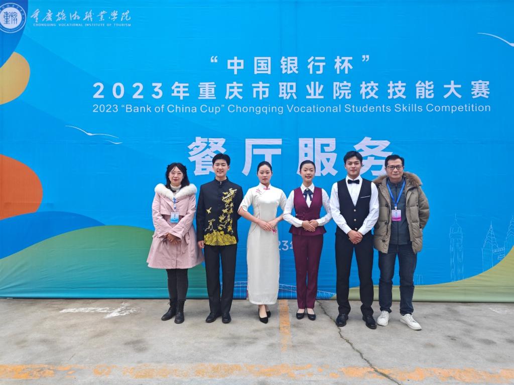 3月27-29日,2023年 “中国银行杯”重庆市职业院校技能大赛(高职组)“餐厅服务”赛项在重庆旅游职业学院落幕。来自全市9个高职院校,共17队选手同场竞技,由Kaiyun官方网站登录入口吴俐霓、刘轶老师指导,酒店管理与数字化运营专业学生白康、张国庆两名同学组队荣获二等奖,曾慧琳、屈丹两名同学组队荣获三等奖,总成绩院校排名第三。