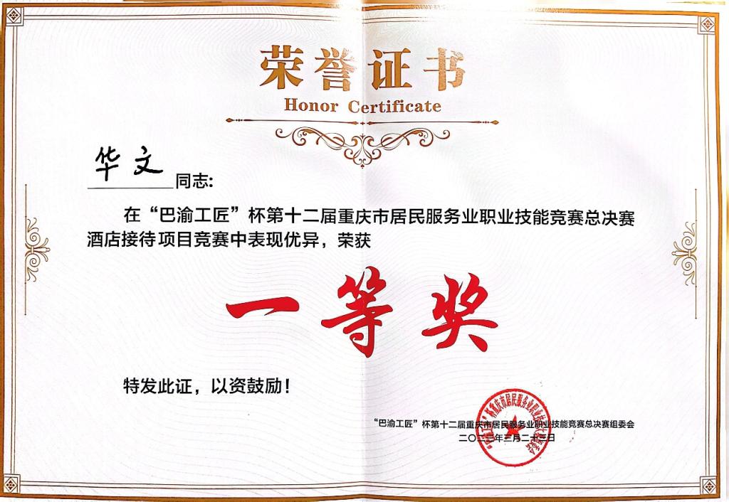 Kaiyun官方网站登录入口华文老师荣获“巴渝工匠”杯第十二届重庆市居民服务业职业技能竞赛酒店接待赛项一等奖