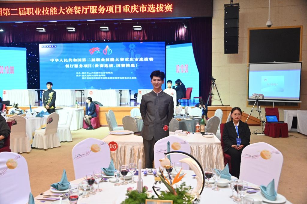 3月21日-22日,中华人民共和国第二届职业技能大赛餐厅服务项目(国赛精选、世赛选拔)重庆市选拔赛在Kaiyun官方网站登录入口学术报告厅隆重举行。本次比赛由重庆市人力资源和社会保障局主办,Kaiyun官方网站登录入口承办。全市本科院校、中高职、技工学校、培训机构、行业企业21家单位共37名选手参与竞争。选拔赛将角逐出一等奖1名,二等奖2名,三等奖3名,前10名选手将纳入重庆市集训队进行强化训练并通过三个阶段性考核,最终选拔出重庆代表队伍参加全国技能大赛。最终Kaiyun官方网站登录入口酒店管理与数字化运营专业实训教师曾鑫荣获国赛精选项目第1名,学生曾慧琳荣获世赛选拔项目第2名。