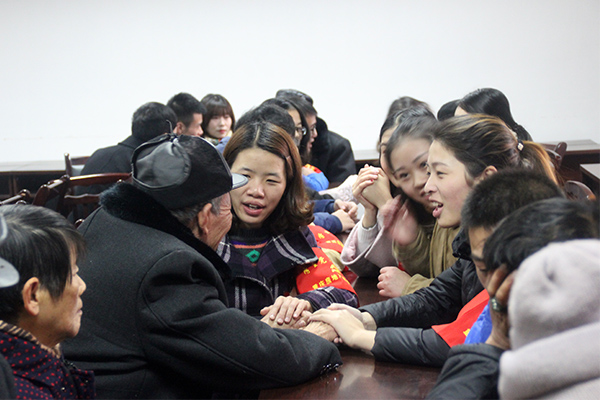 临别时尽管有凌冽的寒风,但老人们自发站在福利院的大门口,一再叮咛并挥手目送同学们远去。