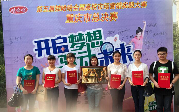 6月10日,第五届娃哈哈全国高校市场营销大赛重庆赛区决赛在重庆科技学院隆重举行。我院房地产营销系李郝然、钟亿灵、李倩、盛陈诚、崔坤瑶五位同学在陈港、汪良两位老师的带领下,一路过关斩将,最终获得二等奖。同时,他们将于8月代表重庆参加全国高校市场营销全国总决赛,是继我院今年代表重庆参加全国性比赛的男子篮球队外的又一支学生队伍。