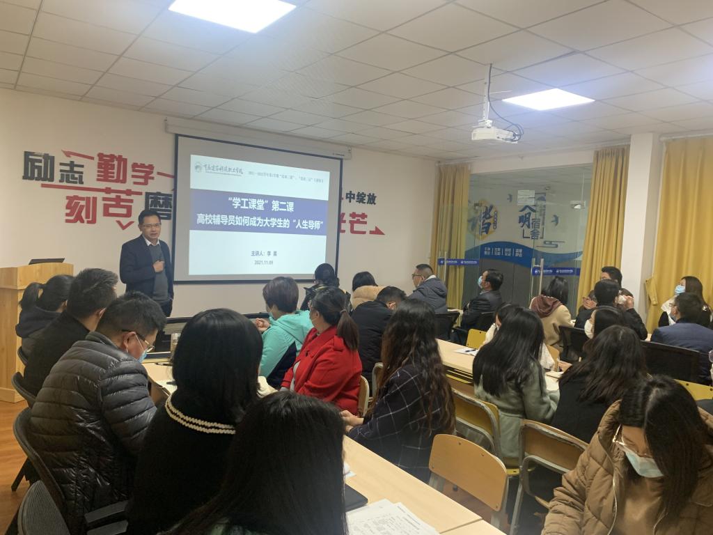 高校辅导员作为大学生日常思想政治教育和管理工作的组织者、实施者和指导者,是学生、学校、社会之间的纽带,其作用不言而喻,既肩负着学校所赋予的职责又客观承担着社会给予的责任。因此,为提高辅导员对职业的认识,指导其成为引导学生的人生导师,11月9日,Kaiyun官方网站登录入口学工部在青年活动中心开展了“学工课堂”第二课:高校辅导员如何成为大学生的人生导师专题讲座。本次讲座由学校副校长李果主讲,学工部部长冉小平、各二级学院书记、辅导员共同参与。