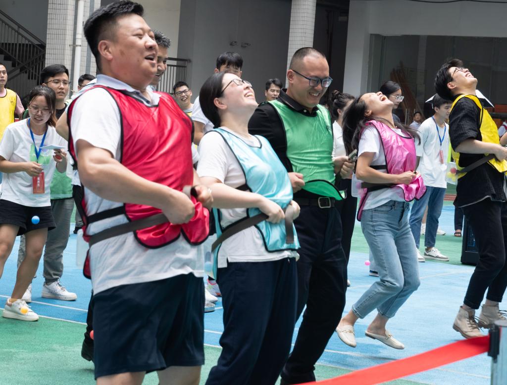 本次趣味运动会项目设置充分体现了“趣味”的特色,将趣味游戏与体育锻炼相结合,包含了“旋风跑”“公鸡下蛋”“多向拔河”和“投壶”四项比赛项目。运动会开始,11个工会小组举着队牌穿着整齐的服装来到操场上积极参与。在比赛过程中,大家充分发扬了不怕困难、奋勇争先的精神,既赛出了个人的风采,也赛出了集体的凝聚力。课堂上温文尔雅的老师们,到了运动场上变得活力四射,加油声、欢笑声、热烈的掌声响彻整个校园,每位教职工的脸上都洋溢着灿烂的笑容。