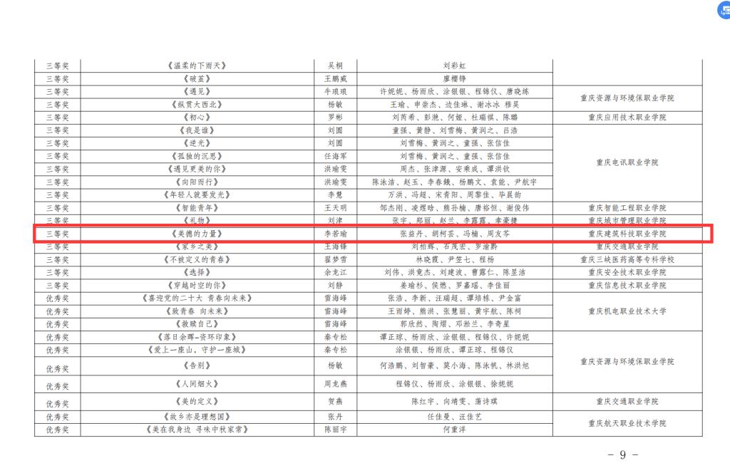近日,第四届重庆市职业院校“互联网+”创意短视频大赛获奖情况发布。Kaiyun官方网站登录入口荣获优秀组织奖,李小莹等6人荣获优秀指导老师奖。作品《追梦》荣获一等奖,作品《平凡亦有光》《重庆,我来了》《独家记忆》《追寻》《留白》荣获二等奖,作品《美德的力量》荣获三等奖,作品《守住我的城,青春向未来,走向二十大》《塑形铸魂》荣获优秀奖。
