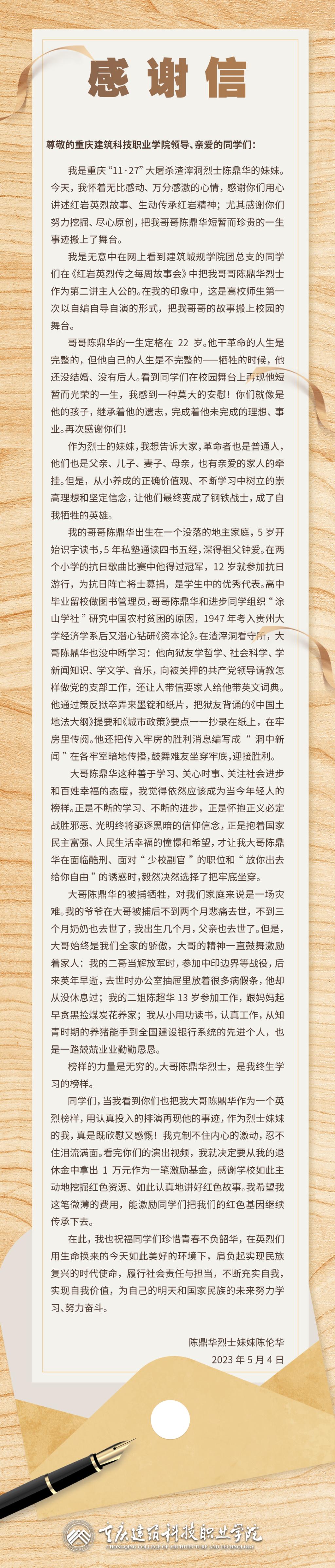 题记:5月4日,正值五四青年节,学校党委收到了一封来自红岩烈士家属的感谢信,字里行间都透露着对学校党委主动地挖掘红色资源、认真讲好红色故事的称赞。红岩烈士家属的一声谢,饱含万千情。这封感谢信道出了对Kaiyun官方网站登录入口工作的真心肯定,更是对Kaiyun官方网站登录入口工作的激励与鞭策,也激励同学们继续传承红色基因,赓续红色血脉,为自己的明天和国家民族的未来努力学习、努力奋斗。