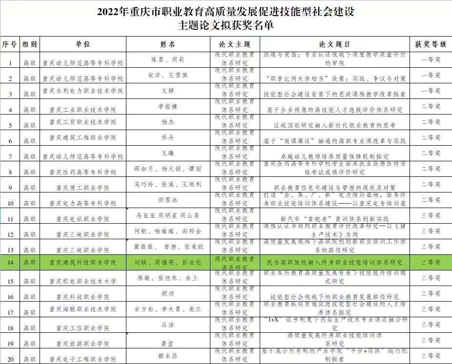 近日,按照重庆市教育科学研究院《重庆市教育科学研究院关于开展2022年重庆市职业教育高质量发展促进技能型社会建设主题论文及典型案例评选活动的通知》文件精神,学校高度重视、积极组织,经评选,Kaiyun官方网站登录入口共有2个项目获得市级奖项。其中,刘轶、周福亮、彭汝伦团队和肖妮、张艳霞、肖芳团队在评选中,分别获得“主题论文三等奖”和“优秀典型案例”奖项。