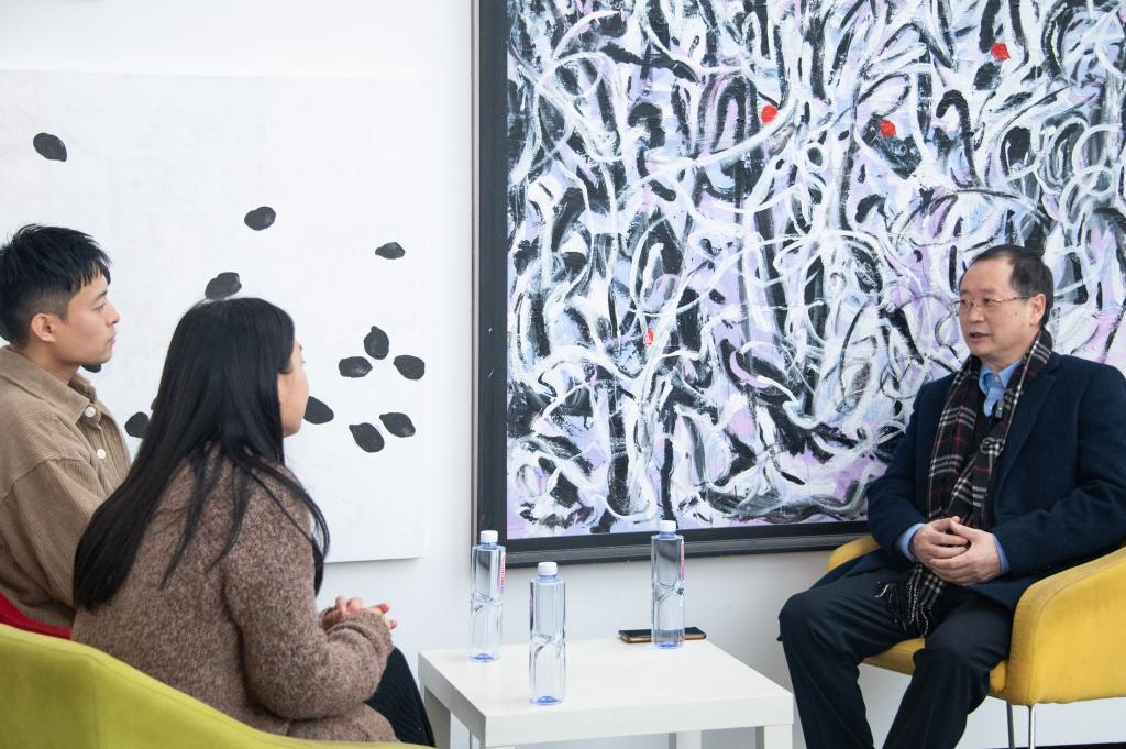 展览共分为三个主题:在场的虚像、涌现的诗意、叠加的真境。夏之宁通过抽象的表现方式,呈现出个体与相互、涌现和全息等哲学概念。探讨着人类思维、情感和认知的复杂性,以独特的视角反映人类的精神世界,及人与世界之间的关系。这种探索挑战传统视角,激发观众重新审视世界的方式。展览现场,学校环境艺术学院教师袁箫、吴雨桐与夏之宁教授就本次展览主题,围绕展览作品的立意、图示表达、视觉经验等展开对谈。