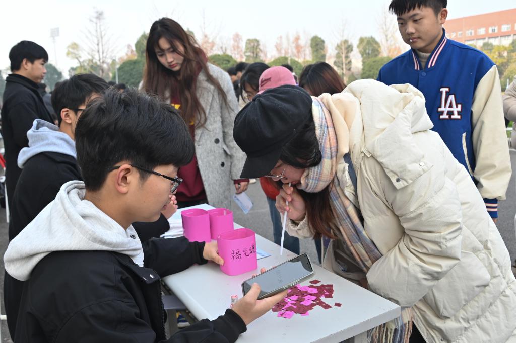 “书山有径独步寻花”主题跨年游园会,吸引师生踊跃参与。游园会内容丰富多彩,包括捐书开盲盒、投壶、快乐“圈圈圈”、博览群书、你画我猜、听歌识曲、覆射之成语大杂烩、飞花令、“缘分相聚,快乐同宵”之吸福气等项目。