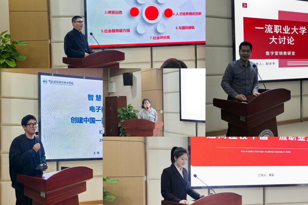会上,首先通过四位教研室老师的精彩分享,明确了创建中国一流职业大学的目标、意义以及未来做法。为了更快更好实现创建中国一流职业大学的目标需要师生共进,学生代表黄蕊从学生角度出发分享了学生心中的校园蓝图和行动指南。会上,周旖院长从人才培养和教学质量的角度出发揭示了产教融合背景下的人才培养新路径,她认为人才培养路径是教育的骨架,师资队伍是教育的灵魂。一支高素质、专业化的教师队伍,是提升教学质量、培养优秀人才的关键。副院长陈雨就探索职业教育新赛道分享了如何建设中国一流职业大学的高水平师资队伍。院长助理费文美分享了产教融合背景下的人才培养模式重构。