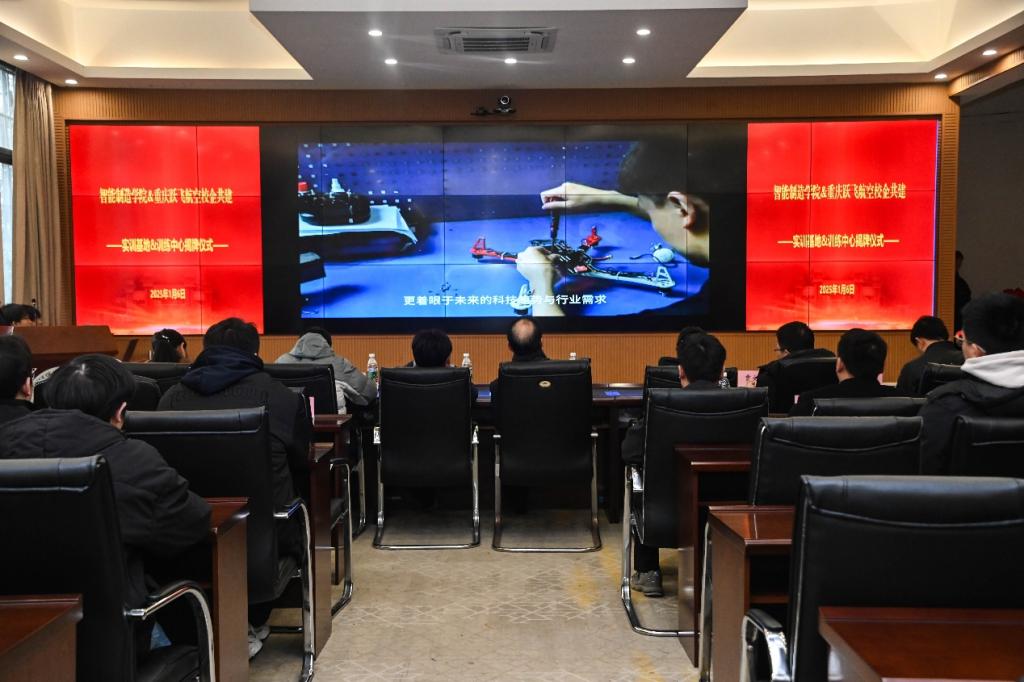1月6日下午,学校智能制造学院与重庆跃飞航空科技有限公司共同成立无人机生产性实训室基地与中国民航(CAAC)无人机执照教学中心。并在大数据中心举行了揭牌仪式。学校何培斌副校长、周俊华副校长和王靖副校长等领导,同重庆跃飞航空科技有限公司樊小龙总经理,以及无人机校企合作专业的学生共同见证了揭牌仪式。