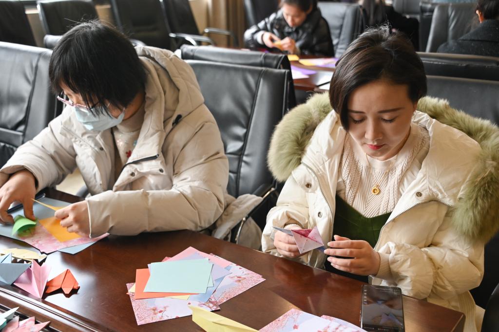 活动以“巧手生花展风采”趣味互动拉开序幕。女教职工们通过创意折纸“解锁”材料包——用彩纸折叠出玫瑰、百合等花卉,或灵动的小动物,即可兑换永生花团扇、花篮、笔筒等精美手工材料包,活动现场欢声笑语不断。