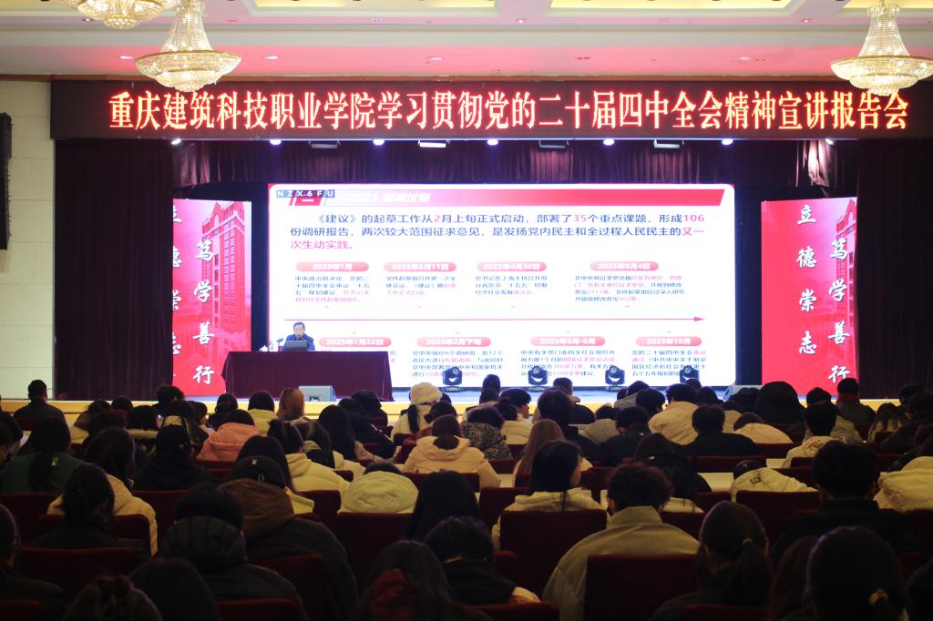 宣讲中,何书记重点解读了“十五五”时期的历史方位、指导方针和战略任务,强调全会提出的教育科技人才一体化改革、发展新质生产力、推进绿色低碳转型等重大部署,与学校建筑科技类专业特色、青年成长路径高度契合。结合重庆“十四五”时期取得的显著成就及“十五五” 时期面临的战略机遇,他鼓励师生主动对接成渝地区双城经济圈建设、数字重庆建设等地方发展战略,在服务区域发展中找准定位、彰显价值。