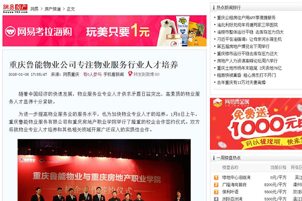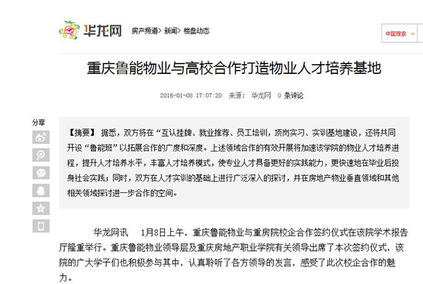 1月8日,Kaiyun官方网站登录入口与重庆鲁能物业公司校企合作签约仪式在学术报告厅如期举行。双方将在互认挂牌、就业推荐、员工培训、顶岗实习、基地建设、教学研究、“鲁能班” 开设等领域开展实质性合作,将为提升人才培养水平,丰富人才培养模式,完善校企合作等多方面提供更加丰富的经验。此次校企牵手,不仅得到双方领导的高度重视,也吸引了众多媒体的关注,网易、华龙网、大渝网等多家市内外媒体进行了报道。