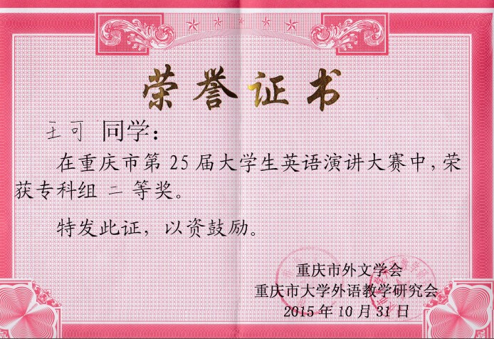 我院学子王可喜获重庆市第25届大学生英语演讲比赛二等奖