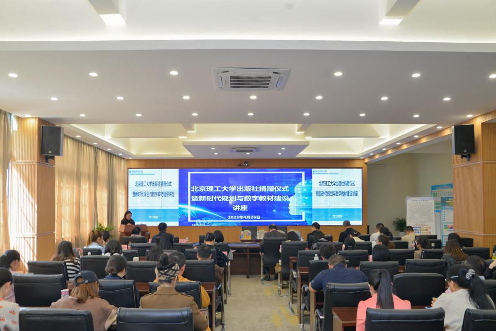 4月26日下午,北京理工大学出版社教材捐赠仪式暨新时代规划与数字教材建设讲座在学校立德大数据中心举行。