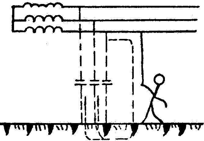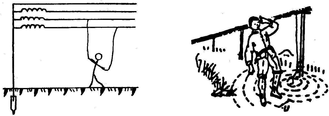 图 2—3 两相触电 图 2—4 跨步触电