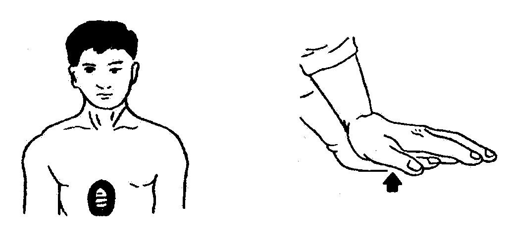 应压陷 3~4cm,频率每分钟 60 次;对 16 岁以下儿童,一般应用一只手挤压,用力要比成人稍轻一点,压陷 1—2cm,频率每分钟 100 次为宜。这样可使压处促到心脏里面的血液(见图 2-10)。