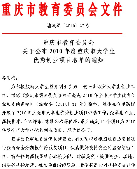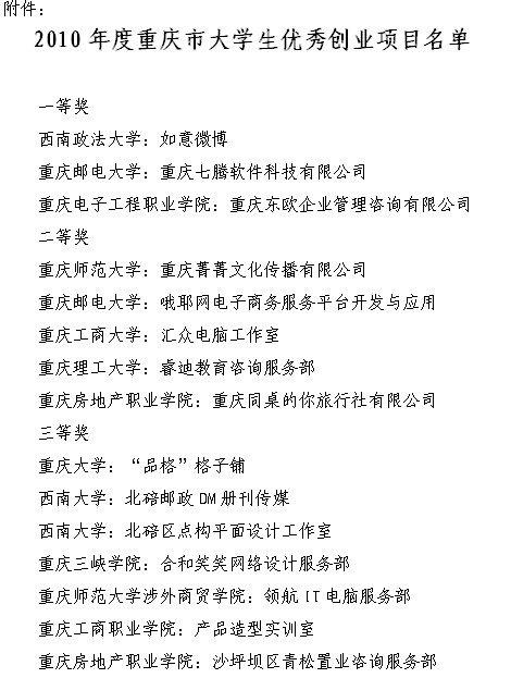 重庆市教育委员会关于公布2010年度重庆市大学生优秀创业项目名单的通知[12-24]