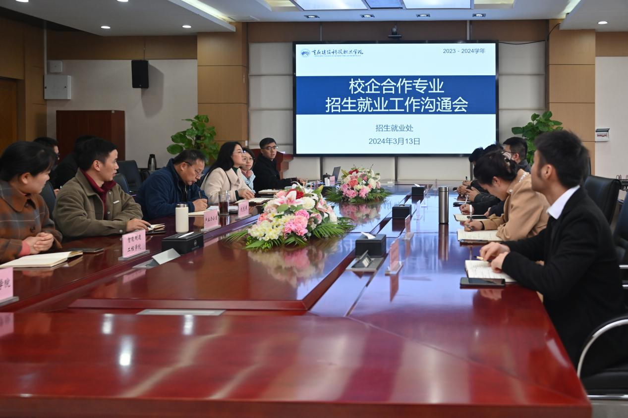 为进一步推动学校产教融合和校企合作工作的发展,促进校企合作专业招生就业工作,学校于3月13日上午,在立德楼六楼会议室召开校企合作招生就业工作沟通会。校长刘东燕、校长助理王靖出席本次会议,招生就业处、产业办公室、二级学院院长书记、校企合作重庆瀚海睿智大数据科技股份有限公司等五家企业参加会议。