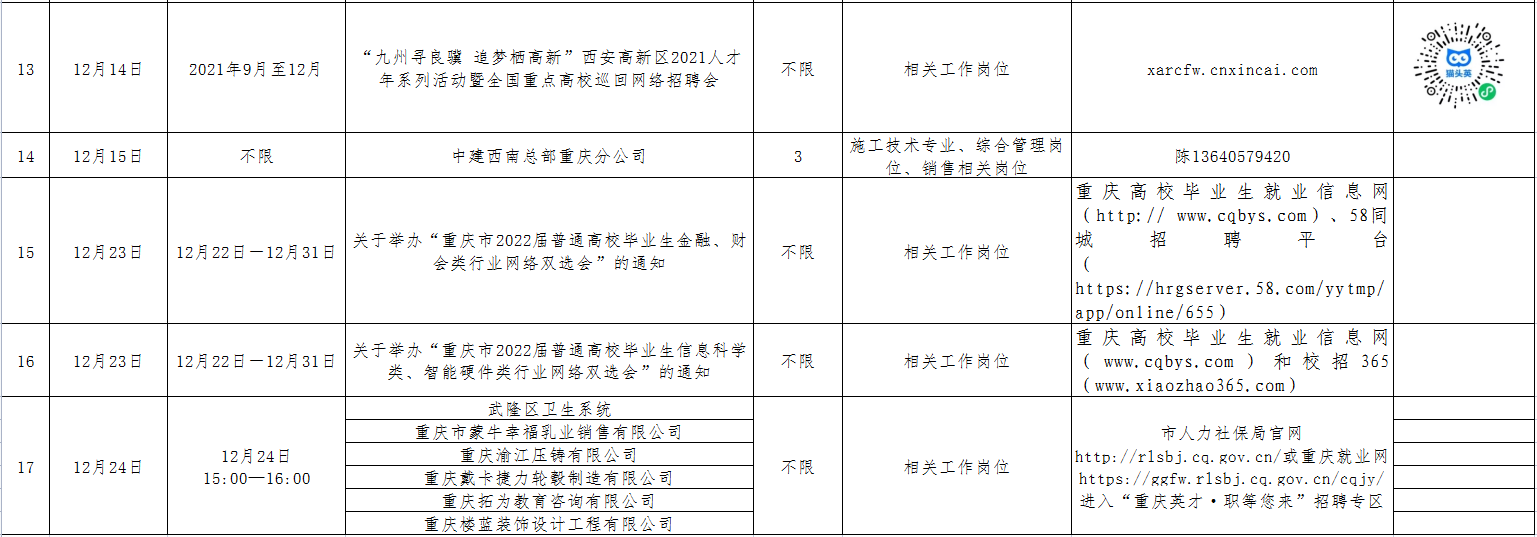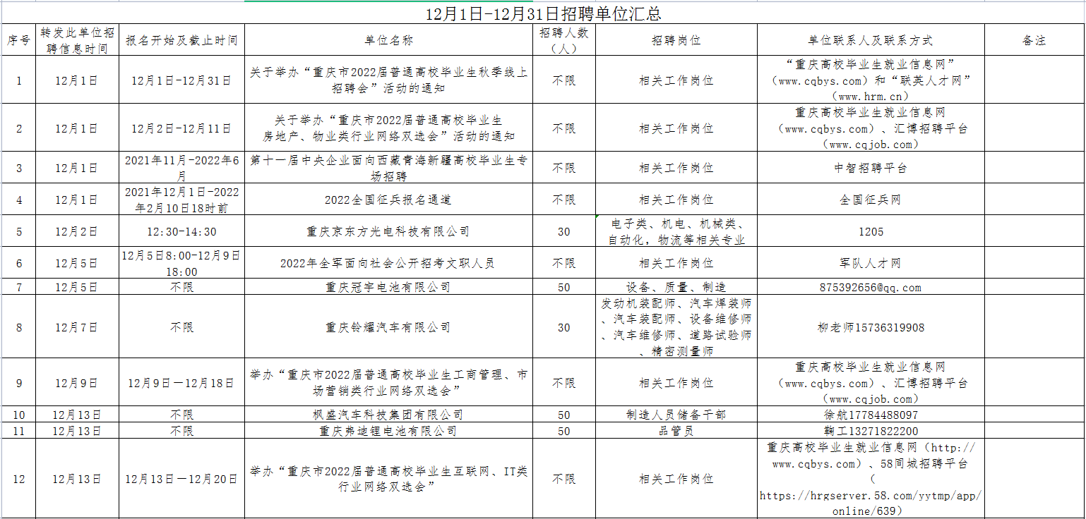 12月1日-12月31日招聘单位汇总