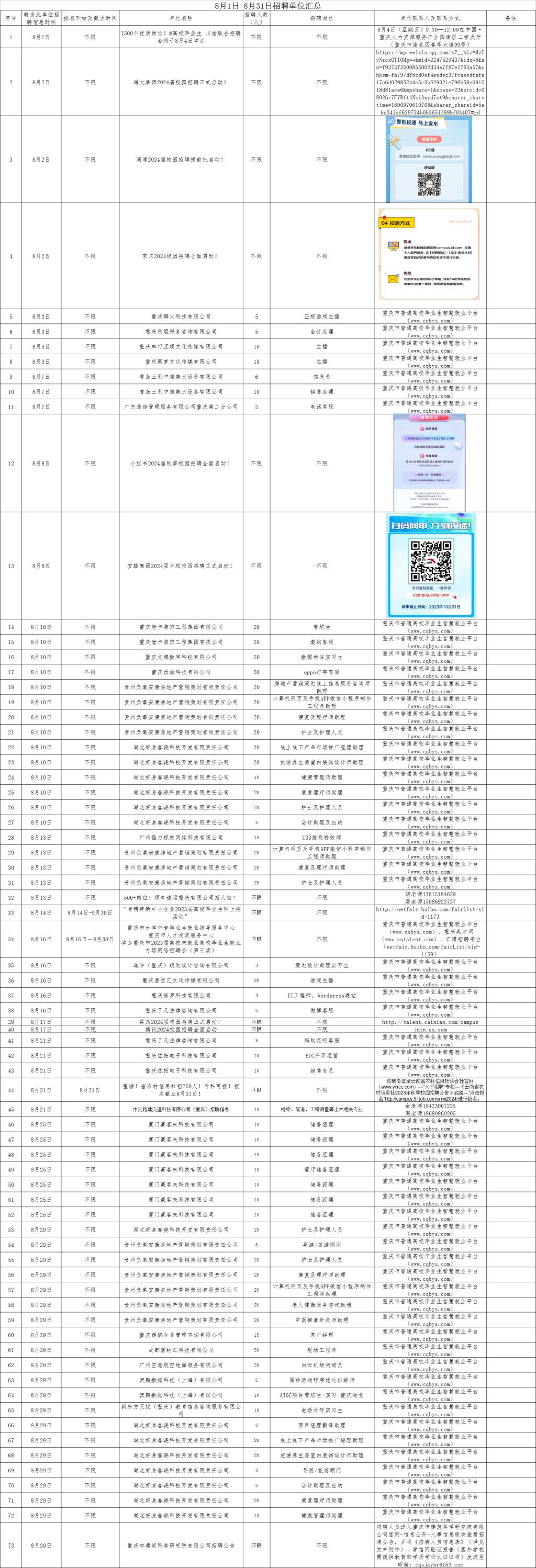上一篇:重庆市大学中专毕业生就业指导服务中心 重庆市人才交流服务中心 关于举办重庆市2024届普通高校毕业生 秋季网络双选会(综合场)的通知 下一篇:重庆市大学中专毕业生就业指导服务中心重庆市人才交流服务中心举办重庆市2023届离校未就业高校毕业生就业专场网络招聘会(第三场)