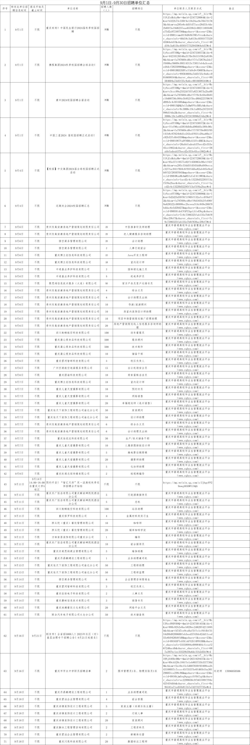 9月1日-9月30日招聘单位汇总